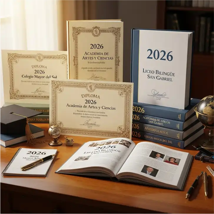 Adaptamos toda la línea gráfica (escudo, colores, tipografía) en sus agendas y libros. No usamos plantillas genéricas; su material es único y exclusivo.